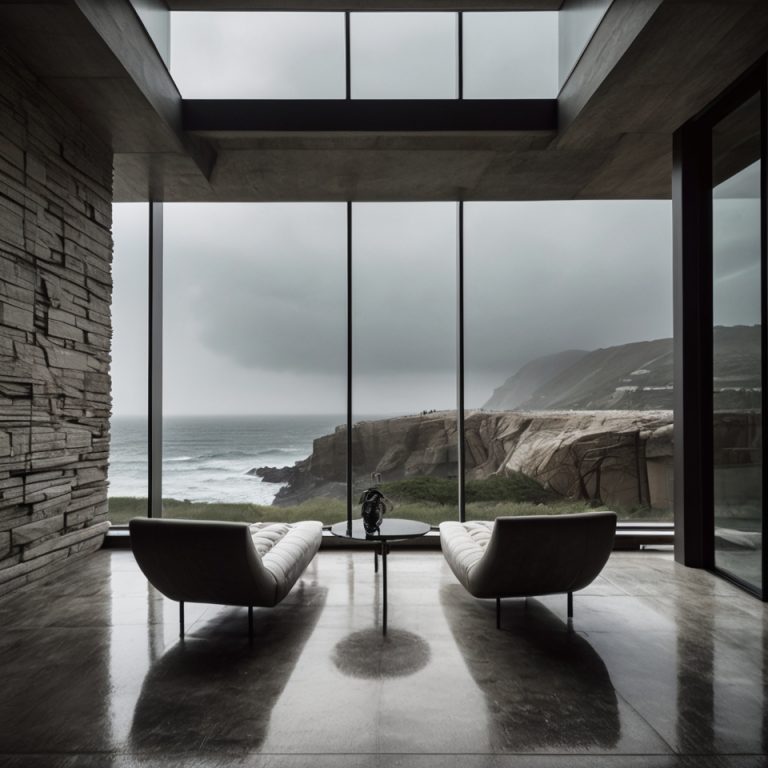 The color palette is muted, focusing on natural tones of grey, beige, and white, allowing the natural surroundings to be the dominant visual feature.In essence, this is a house designed as a sanctuary, a minimalist vessel from which to experience and appreciate the powerful beauty of the ocean.